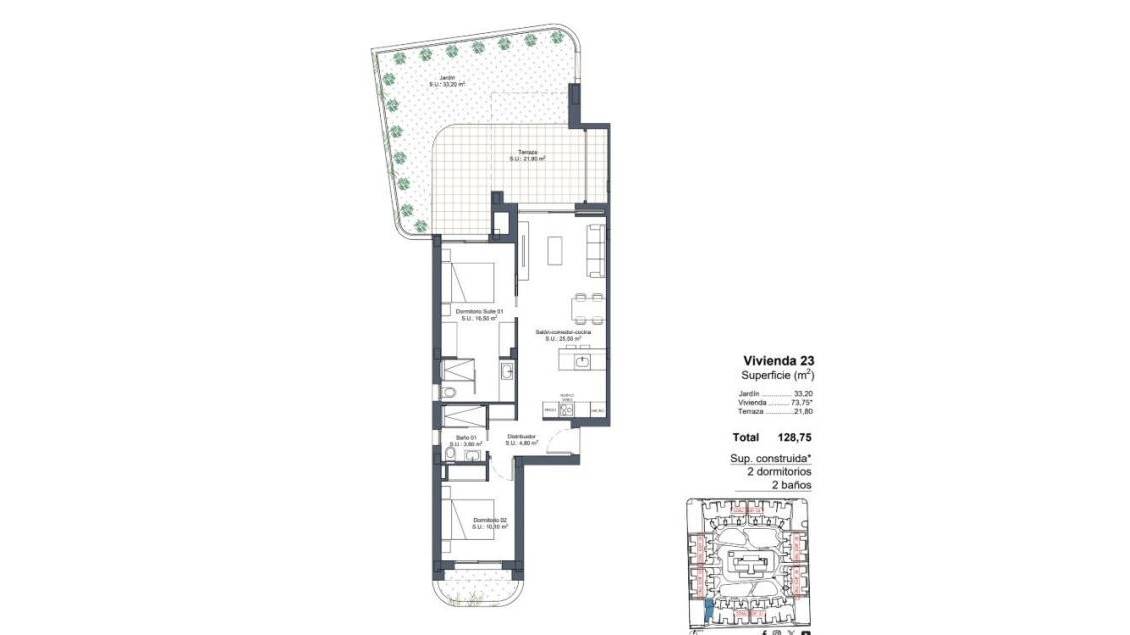 Exclusivas Viviendas de Obra Nueva en Lo Marabú, Ciudad Quesada Diseño Moderno y Máximo Confort en un Entorno Mediterráneo Descubra este espectacular complejo residencial en Lo Marabú, Ciudad Quesada, compuesto por 80 viviendas de 2 y 3 dormitorios con 2 baños. Diseñadas con un enfoque moderno y eficiente, estas propiedades ofrecen amplias terrazas, ventilación cruzada y acabados de alta calidad para maximizar el confort y la eficiencia energética. Las viviendas en planta baja cuentan con jardines privados, mientras que las de la planta alta disponen de soláriums privados con preinstalación para jacuzzi y ducha exterior. Además, el residencial dispone de piscinas comunitarias rodeadas de jardines, creando un ambiente perfecto para el relax y la convivencia. Características de Alta Calidad para un Estilo de Vida Exclusivo Cada vivienda ha sido diseñada para ofrecer el máximo confort, con materiales de primera calidad y un diseño contemporáneo: Amplios ventanales correderos de aluminio con rotura de puente térmico. Persianas motorizadas para mayor comodidad. Cristales Climalit 4+4/14/4+4 para aislamiento térmico y acústico. Puerta de entrada acorazada con cerradura de seguridad. Cocinas totalmente amuebladas con electrodomésticos incluidos. Baños con muebles, espejos y mamparas de ducha. Sistema de aerotermia de 150L para agua caliente. Instalación completa de aire acondicionado por conductos (frío/calor). Iluminación en todas las estancias ya incorporada. Plaza de parking incluida. Gracias a su diseño pasante de doble fachada, las viviendas ofrecen ventilación natural cruzada, proporcionando frescor en verano y reduciendo el consumo energético en climatización. Ubicación Privilegiada en Ciudad Quesada Lo Marabú es una exclusiva zona residencial dentro de Ciudad Quesada (Rojales), rodeada de espacios naturales y con todos los servicios a su alcance. La urbanización se encuentra muy cerca de las Lagunas Saladas de La Mata y Torrevieja, un entorno ideal para disfrutar de la naturaleza y mejorar el bienestar. Desde su nueva vivienda, tendrá acceso rápido a los principales puntos de interés de la zona: Playas de Guardamar del Segura y Torrevieja – 10 km (15 minutos en coche). Aeropuerto de Alicante-Elche (ALC) – 38 km (35 minutos en coche). Aeropuerto de Murcia-Corvera (RMU) – 65 km (50 minutos en coche). Campos de golf de prestigio – A menos de 5 km. Centros comerciales y restaurantes – A pocos minutos. Acceso rápido a las carreteras AP-7 y N-332, conectando con toda la Costa Blanca. Un Hogar Perfecto para Disfrutar del Mediterráneo Con su combinación de diseño moderno, ubicación estratégica y entorno natural excepcional, estas viviendas en Lo Marabú son ideales tanto para residencia permanente, casa de vacaciones o inversión inmobiliaria. No pierda esta oportunidad única. Contáctenos hoy mismo para más información o para concertar una visita a su futura vivienda en Ciudad Quesada.