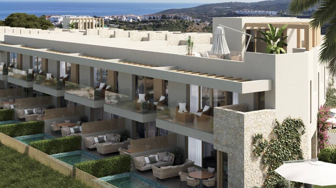 Modernas casas adosadas de nueva construcción en venta en Manilva, Costa del Sol Diseño contemporáneo con énfasis en el espacio y la luz Esta exclusiva promoción nueva en Manilva cuenta con 20 casas adosadas de primera calidad diseñadas para maximizar el espacio, la luz natural y el confort. Con distribuciones de 3 y 4 dormitorios, cada vivienda incluye amplias zonas de estar, cocinas totalmente equipadas con acabados de alta calidad e interiores modernos que combinan a la perfección la vida interior y exterior. Los techos altos, los amplios ventanales y la cuidada distribución crean espacios luminosos y aireados, perfectos para disfrutar del estilo de vida mediterráneo. Características de lujo y opciones personalizadas Las propiedades en esquina cuentan con una planta adicional con solárium, ideal para tomar el sol en privado o recibir invitados, mientras que otras viviendas ofrecen vistas panorámicas del mar Mediterráneo o de los frondosos valles verdes. Algunas viviendas incluyen jardines privados con la opción de añadir una piscina de inmersión, lo que proporciona un mayor nivel de exclusividad. Las instalaciones comunes incluyen una piscina infinita, un gimnasio totalmente equipado y un elegante salón para residentes, todo ello diseñado para mejorar la relajación y el bienestar. Ubicación privilegiada en las colinas de Manilva Situado en una de las zonas más cotizadas de Manilva, el complejo combina tranquilidad, privacidad y conectividad. Su elevada posición garantiza unas vistas despejadas del mar, los verdes valles y las montañas circundantes. Los residentes pueden disfrutar de impresionantes amaneceres y atardeceres desde sus terrazas, al tiempo que se benefician de un fácil acceso a todos los servicios esenciales, incluyendo colegios internacionales, restaurantes, tiendas y centros de bienestar. Excelente conectividad y puntos de interés cercanos Perfectamente conectado a través de las autopistas A-7 y AP-7, el complejo ofrece cortos trayectos en coche a los destinos más deseados de la región: Playa de La Chullera: 1,8 km Puerto deportivo de Puerto de la Duquesa: 3 km Centro de Estepona: 15 km Sotogrande: 12 km Marbella: 40 km Aeropuerto Internacional de Gibraltar: 35 km Aeropuerto de Málaga: 95 km Campos de golf de renombre, como La Duquesa Golf, Finca Cortesín y Valderrama, a entre 5 y 20 km. Un estilo de vida mediterráneo y tranquilo Manilva, conocida por sus playas vírgenes y sus pintorescos viñedos, ofrece una mezcla única de encanto costero y belleza natural. Esta urbanización ofrece una oportunidad única de disfrutar de una ubicación tranquila en la ladera de una colina, a la vez que se encuentra cerca de puertos deportivos, campos de golf y atracciones culturales. Asegúrese hoy mismo la casa adosada de sus sueños en Manilva Tanto si busca una residencia permanente, una casa de vacaciones o una oportunidad de inversión, estas casas adosadas de nueva construcción ofrecen un valor, una calidad y un diseño excepcionales. Póngase en contacto con nosotros ahora para concertar una visita privada y descubrir su futuro hogar en la Costa del Sol.