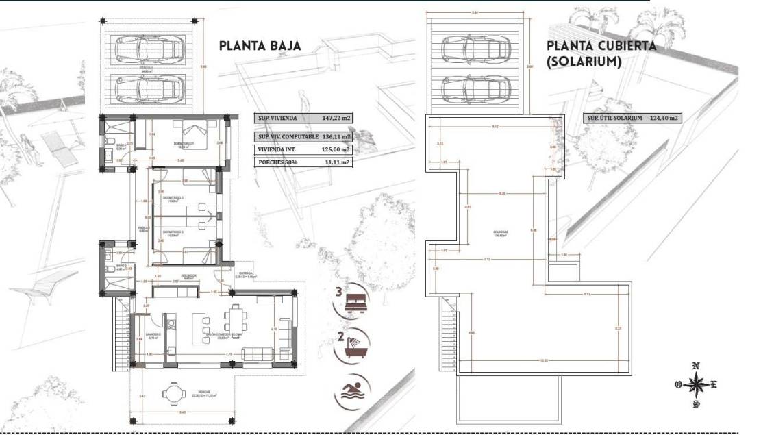 Villa de nueva construcción con piscina privada en Vistabella, Jacarilla Exclusiva villa de nueva construcción en un entorno natural y de golf Esta villa de nueva construcción, bajo régimen de autopromoción, se encuentra en la tranquila zona de Vistabella, dentro del municipio de Jacarilla. Situada en un entorno natural entre el campo de golf de Vistabella y el embalse de La Pedrera, esta propiedad ofrece privacidad, vistas abiertas y un relajado estilo de vida mediterráneo. La zona es ideal para quienes buscan tranquilidad sin alejarse de la costa, los campos de golf y los servicios cotidianos. Vistabella es una conocida zona residencial muy popular entre los compradores internacionales gracias a su campo de golf, sus restaurantes locales y su proximidad a Orihuela Costa y Torrevieja. Jacarilla conserva su encanto tradicional español y ofrece tiendas locales, servicios y un ambiente acogedor durante todo el año. Moderna distribución en una sola planta con amplias zonas exteriores La villa se distribuye en una sola planta y ha sido diseñada para combinar comodidad, funcionalidad y luz natural. Ofrece 3 dormitorios y 2 baños, incluido un dormitorio principal con baño en suite. La sala de estar y el comedor de planta abierta conectan a la perfección con la moderna cocina, creando un espacio luminoso y acogedor. Una terraza cubierta de 22 m² proporciona acceso directo al jardín privado, donde una piscina privada y zonas ajardinadas invitan a disfrutar del estilo de vida al aire libre. La generosa parcela de 750 m² también incluye una plaza de aparcamiento para dos vehículos. Solárium privado con vistas abiertas Uno de los aspectos más destacados de esta villa es el impresionante solárium privado de 120 m², al que se accede a través de una escalera exterior. Desde aquí se puede disfrutar de vistas panorámicas abiertas del campo circundante, perfectas para tomar el sol, entretenerse o relajarse durante todo el año. Especificaciones de calidad y características de eficiencia energética La villa está construida con materiales de calidad y especificaciones modernas para garantizar el confort y la eficiencia. Entre sus características se incluyen una puerta de entrada de seguridad reforzada, un sistema aerotérmico para el agua caliente sanitaria, persianas eléctricas en el salón y los dormitorios, y preinstalación de aire acondicionado por conductos. Estos elementos proporcionan una base ideal para una vivienda cómoda y energéticamente eficiente. Excelente ubicación cerca del golf, la naturaleza y la costa Vistabella Golf se encuentra a unos 2 km, mientras que el embalse de La Pedrera está a solo 1,5 km de la propiedad, ideal para los amantes de la naturaleza y las actividades al aire libre. Las playas de Orihuela Costa están a unos 15 km. El aeropuerto internacional de Alicante está a unos 55 km, lo que ofrece fáciles conexiones con los principales destinos europeos. En un radio de 10 a 15 km se pueden encontrar varios campos de golf y zonas comerciales adicionales. Una oportunidad única en la Costa Blanca Esta villa de nueva construcción en Vistabella es perfecta como residencia permanente, casa de vacaciones o oportunidad de inversión en una ubicación muy solicitada. Póngase en contacto con nosotros hoy mismo para recibir más información y asegurarse su nueva vivienda en el corazón de la Costa Blanca.