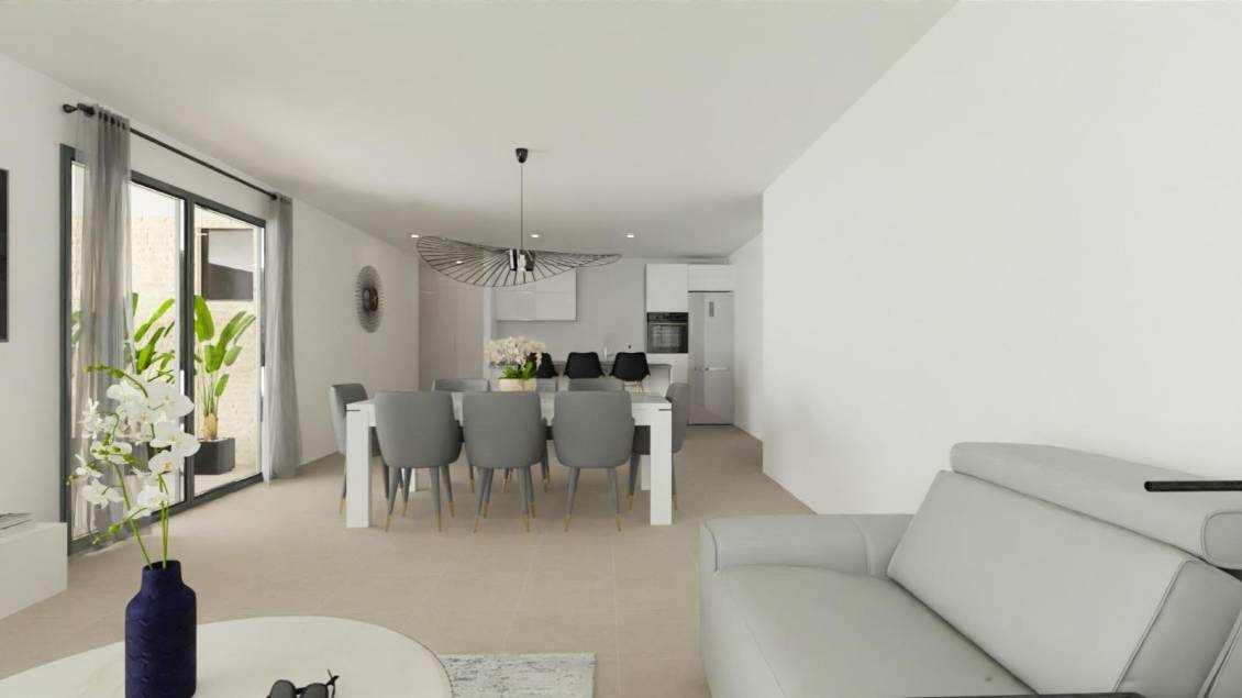 VILLAS DE OBRA NUEVA CON PISCINA PRIVADA EN MONFORTE DEL CID Villas de obra nueva en Monforte del Cid, con el campo de golf a sólo 3 minutos de casa y justo al lado de las ciudades de Alicante y Elche, donde encontrará una amplia oferta cultural, gastronómica, de ocio y por supuesto de costa. Las playas de arena dorada del Mediterráneo a un paso de tu nuevo hogar, un espacio donde disfrutar de días de sol y mar en cualquier momento. Villas situadas a 3 minutos del centro deportivo del campo de golf Alenda Golf, lo que la convierte en la ubicación perfecta para disfrutar de la paz de una urbanización tranquila pero tener todos los servicios al lado de casa (A tan sólo 12 minutos del Aeropuerto de Alicante-Elche). La urbanización es una comunidad que reúne lo mejor de la vida moderna y la tranquilidad del entorno natural (Sin gastos de comunidad). Descubra la elegancia y el confort de este precioso chalet independiente de 129 m2, diseñado para ofrecerle un estilo de vida excepcional, todo en planta baja. Situada en la prestigiosa Urbanización, esta propiedad le ofrece una experiencia de vida única y de calidad. En parcelas desde 834 m2, proporcionándole un amplio espacio para disfrutar tanto del interior como del exterior. Disfrute de la privacidad que le ofrece este chalet independiente, donde podrá relajarse en su propio jardín con piscina privada incluida. La casa se distribuye en dos grandes zonas: Zona de día: Donde encontramos un amplio salón comedor con cocina abierta tipo office (muebles de cocina incluidos) que conecta con el amplio y moderno porche a través de sus dos grandes ventanales, dando paso a la zona exterior ajardinada y por qué no... a la piscina. La luz inunda cada rincón gracias a los grandes ventanales del salón, que se abren al porche, un espacio moderno y funcional que invita a disfrutar al máximo del aire libre. Imagina pasar las tardes con la familia y los amigos, rodeado de un entorno sereno y natural. Como espacio extra, cuenta con una zona de lavandería estratégicamente situada en la distribución de la vivienda donde será muy fácilmente accesible desde cualquier punto de la casa. Zona de noche o descanso: En esta zona encontramos 3 dormitorios. El dormitorio principal cuenta con un amplio vestidor y baño en suite. Además, un segundo baño para dar servicio al resto de dormitorios y vivienda. Aquí no sólo encontrará una comunidad residencial, sino un lugar donde la naturaleza y la elegancia se entrelazan para proporcionarle un estilo de vida inigualable. Ya sea para establecer su residencia permanente, para disfrutar de una casa de vacaciones o si desea invertir en su futuro, esta villa es perfecta para usted. Urbanización privada cercana a las principales ciudades de la provincia de Alicante, a 15 minutos en coche de Elche y Alicante, así como del aeropuerto y de las mejores playas. La urbanización se encuentra en un entorno tranquilo cerca del campo de golf Alenda en Monforte del Cid.