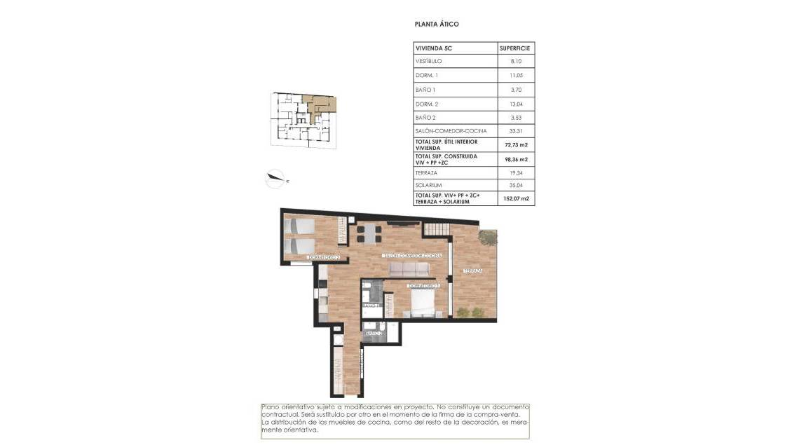 Modernos apartamentos de nueva construcción en el centro de Torrevieja, Costa Blanca Exclusiva promoción residencial con servicios de primera calidad Descubra un selecto proyecto de nueva construcción de 35 modernos apartamentos en el corazón de Torrevieja. Con distribuciones de 1, 2 o 3 dormitorios y 2 o 3 baños, esta residencia también cuenta con lujosos áticos con soláriums privados. Diseñada para ofrecer comodidad y estilo, esta comunidad combina una arquitectura contemporánea con acabados de alta calidad y excepcionales instalaciones comunes. Ubicación privilegiada en el centro de Torrevieja Situada a solo 600 metros de la playa de Acequion, esta promoción goza de una de las ubicaciones más privilegiadas de Torrevieja. Con supermercados, restaurantes, servicios médicos, tiendas y transporte público a poca distancia, es la opción perfecta para aquellos que buscan un cómodo estilo de vida mediterráneo cerca de todo. Torrevieja es famosa por su clima mediterráneo templado, sus hermosas playas de arena y sus animados paseos marítimos, lo que la convierte en uno de los principales destinos de la Costa Blanca. Instalaciones de estilo resort para el bienestar y la relajación El edificio incluye una excepcional gama de servicios comunes. En la planta baja encontrará una piscina climatizada, un espacio social y un gimnasio totalmente equipado. El solárium de la azotea ofrece un auténtico oasis de relajación con tumbonas, sauna finlandesa, zona de barbacoa y minipiscina con jacuzzi. Tanto las escaleras como el ascensor conducen a la azotea, lo que ofrece comodidad y accesibilidad a todos los residentes. Viviendas de alta calidad con diseño contemporáneo Estos apartamentos de nueva construcción cuentan con cocinas americanas integradas en el salón, amplias terrazas, armarios empotrados y cocinas totalmente equipadas con electrodomésticos. Los baños incluyen muebles, mamparas de ducha y calefacción por suelo radiante para un máximo confort. También hay preinstalación para aire acondicionado por conductos. Hay aparcamiento subterráneo y trasteros opcionales disponibles con un coste adicional. Rodeado de naturaleza y belleza costera Torrevieja es famosa por sus lagunas salinas naturales y sus parques naturales protegidos. El Parque Natural de La Mata y Torrevieja se encuentra a poca distancia de la ciudad y ofrece hermosos senderos y espectaculares lagos salinos de color rosa y verde. Este entorno único proporciona un estilo de vida saludable y paisajes impresionantes. Distancias a puntos de interés clave Playa de Acequion 0,6 km Puerto deportivo de Torrevieja 1,5 km Parque Natural de La Mata 4 km Villamartin Golf 8 km Aeropuerto de Alicante 45 km Aeropuerto de Murcia 60 km Viva el estilo de vida mediterráneo No pierda la oportunidad de adquirir una vivienda moderna en una de las ciudades costeras más deseadas de España. Póngase en contacto con nosotros hoy mismo para concertar una visita y asegurarse su plaza en esta excepcional nueva promoción.