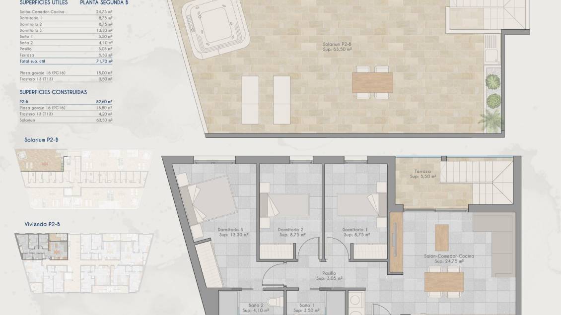 Appartements neufs à vendre à Lo Pagan (San Pedro del Pinatar) près de la plage La vie méditerranéenne moderne à Lo Pagan Découvrez ces élégants appartements neufs à vendre à Lo Pagan, une charmante zone côtière située à San Pedro del Pinatar, sur la magnifique Costa Calida. Situé dans le quartier réputé de Los Cuarteros, ce complexe résidentiel offre un cadre de vie privilégié à seulement 500 mètres de la plage et à proximité de tous les services essentiels, restaurants, commerces et lieux de loisirs. Lo Pagan est célèbre pour son atmosphère balnéaire décontractée, les eaux calmes de la Mar Menor et plus de 300 jours d'ensoleillement par an. La région allie le charme traditionnel espagnol à des équipements modernes, ce qui en fait une destination idéale pour y vivre à l'année ou pour y passer ses vacances. Appartements contemporains avec terrasses et solariums privés Le complexe propose une sélection d'appartements au rez-de-chaussée et aux étages intermédiaires avec de spacieuses terrasses, ainsi que des penthouses exclusifs avec solariums privés sur le toit. Les solariums comprennent une pergola et un espace barbecue, créant ainsi le cadre idéal pour prendre ses repas en plein air et se détendre sous le soleil méditerranéen. Chaque propriété a été conçue pour allier une architecture contemporaine à un style méditerranéen chaleureux. La cuisine ouverte s'intègre parfaitement au salon et à la salle à manger, créant des espaces de vie lumineux et confortables. De grandes terrasses prolongent les espaces intérieurs et constituent l'endroit idéal pour prendre le petit-déjeuner en plein air ou se retrouver le soir. Les chambres sont équipées d'armoires encastrées et les salles de bains modernes sont entièrement équipées, offrant confort et finitions élégantes dans toute la maison. Caractéristiques de qualité et équipements collectifs Ces maisons sont construites avec le souci du détail et comprennent des spécifications de haute qualité pour garantir confort et efficacité. Cuisine entièrement équipée avec appareils électroménagers Salles de bains entièrement équipées avec des finitions modernes Climatisation centralisée entièrement installée Place de parking privée et débarras inclus avec chaque propriété Les résidents peuvent également profiter d'excellents équipements collectifs, notamment une piscine entourée d'espaces de détente et une salle de sport entièrement équipée, idéale pour maintenir un mode de vie actif tout au long de l'année. Excellent emplacement sur la Costa Calida Ce complexe bénéficie d'un emplacement stratégique à proximité des plages, des terrains de golf et des principales destinations le long de la côte. Playa de Villananitos 0,5 km Real Club Nautico de Lo Pagan 0,5 km Lo Romero Golf 10 km Aéroport international de Murcie 40 km Carthagène 35 km Les plages voisines de la Mar Menor, telles que Playa de La Puntica, sont réputées pour leur sable fin et leurs eaux calmes, idéales pour la baignade, la voile et les sports nautiques. Votre nouvelle maison en bord de mer vous attend Profitez du soleil, des plages et d'un style de vie côtier dynamique dans l'une des zones les plus prisées de la Costa Calida. Contactez-nous dès aujourd'hui pour obtenir plus d'informations sur ces appartements neufs à Lo Pagan et réservez votre place en bord de mer.