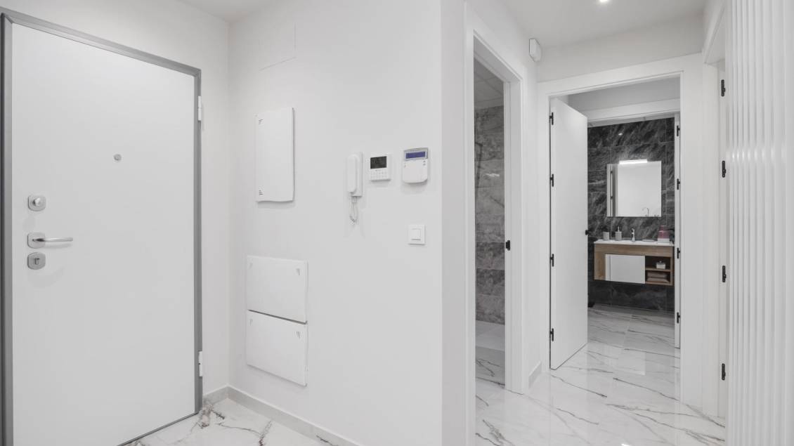 Nytt boligprosjekt i San Miguel de Salinas, et steinkast fra sentrum Romslige leiligheter med imponerende fasiliteter Dette nybygde boligkomplekset i San Miguel de Salinas tilbyr moderne 2-romsleiligheter med romslige terrasser, nøye fordelt over syv etasjer. Det inngjerdede området tilbyr førsteklasses fasiliteter, inkludert separate svømmebassenger for voksne og barn, frodige grøntområder, en lekeplass for barn og et petanqueområde. Privilegert beliggenhet på Costa Blanca Denne urbanisasjonen ligger i den sjarmerende byen San Miguel de Salinas, og har en strategisk beliggenhet på Costa Blanca. Det ligger innen gangavstand fra sentrum, hvor du finner alle de viktigste fasilitetene for dagliglivet, inkludert butikker, restauranter og helsesentre. Eiendommen ligger en kort kjøretur fra flere severdigheter: Las Colinas og Campoamor golfbaner: Bare 7 km unna, perfekt for golfelskere. Strendene i Orihuela Costa og Torrevieja: Ligger omtrent 10 km fra boligen, og tilbyr vakre sandstrender. Kjøpesentre: Zenia Boulevard, et populært shoppingmål, ligger bare 9 km unna. Alicante lufthavn: 50 km unna. Murcia Corvera lufthavn: Ca. 55 km unna, ideelt for regionale forbindelser. Spesifikasjoner av høy kvalitet Alle leilighetene er designet med tanke på moderne finish og funksjonalitet: Fullt utstyrt kjøkken med hvitevarer inkludert. Motoriserte persienner. Sikkerhetsinngangsdør. Varmt vann med aerotermisk oppvarming. Fullt installert luftkondisjonering med kanaler. LANSERING TILBUD: Møbelpakke inkludert for de første enhetene som selges. I tillegg inkluderer alle leilighetene en utpekt parkeringsplass. Om San Miguel de Salinas San Miguel de Salinas er en pittoresk kommune i Vega Baja del Segura-regionen, en del av det livlige Valencia-samfunnet. Landsbyen ligger nær grensen til Murcia, og byr på fantastisk utsikt over lagunene Torrevieja og La Mata, i tillegg til en rolig og familiær atmosfære. Ditt nye hjem venter på deg Enten du er ute etter et feriested eller en permanent bolig, kombinerer dette nye prosjektet i San Miguel de Salinas luksus, komfort og en uslåelig beliggenhet. Kontakt oss i dag for å avtale en visning og ta det første skrittet mot drømmeboligen din på Costa Blanca.