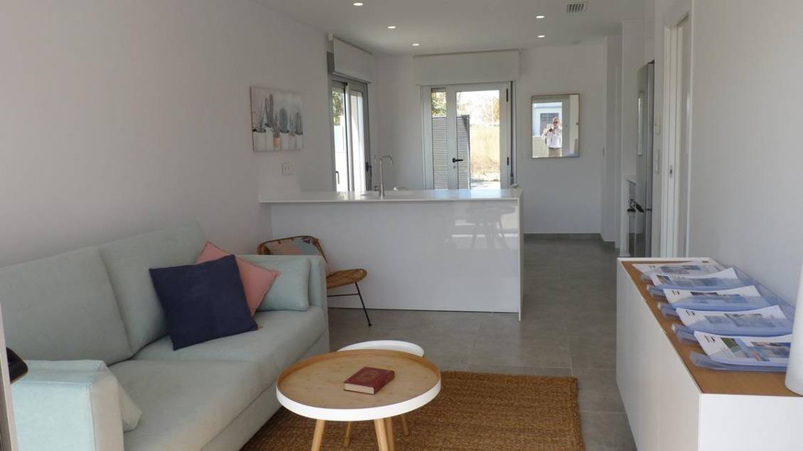 Nybygd boligkompleks med moderne bungalower og rekkehus i Pilar de la Horadada. De nybygde rekkehusene har 3 soverom, 3 bad, åpen kjøkkenløsning med romslig stue/spisestue, innebygde garderober og terrasse. Alle boligene har privat parkeringsplass og bod. Bungalower i første etasje med privat hage og bungalower i toppetasjen med privat solarium. Alle leilighetene har privat parkeringsplass og bod. Pilar de la Horadada er en typisk spansk landsby i den sørligste delen av Costa Blanca. I den store hovedgaten finner du supermarkeder, mange butikker, restauranter og barer og noen vakre torg. De vakre strendene Torre de la Horadada og Mil Palmeras med fin sandstrand ligger bare 5 minutter unna. Flyplassene i Corvera (Murcia) og Alicante ligger henholdsvis 40 og 55 minutter unna.