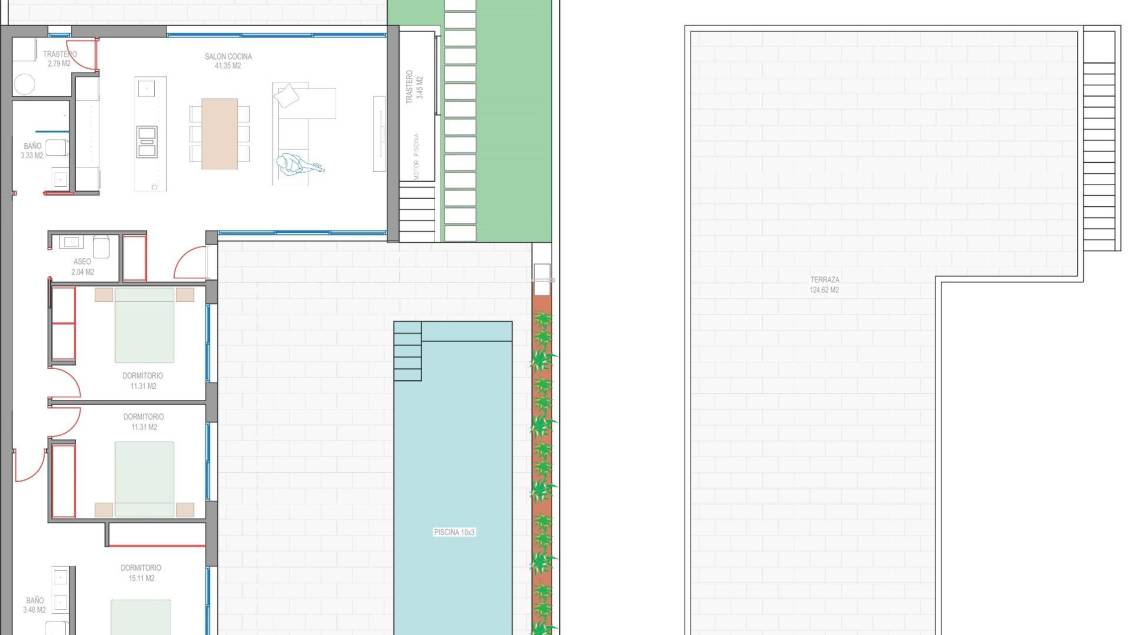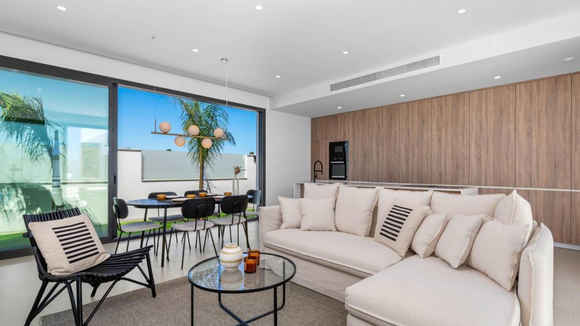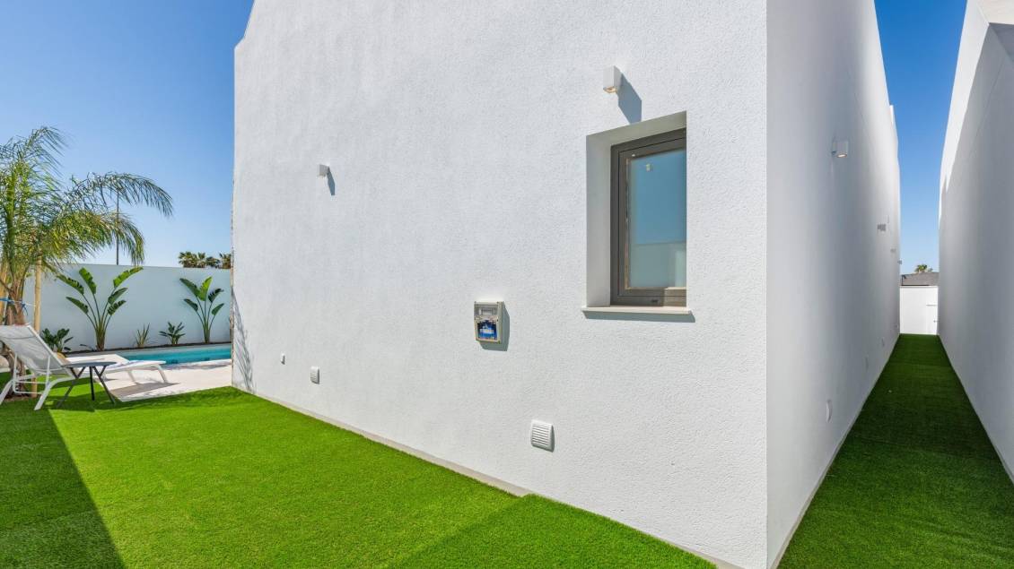 Nowe wille w pobliżu pola golfowego Serena Golf w Los Alcazares Nowoczesne wille w doskonałej lokalizacji nad morzem i polem golfowym Ten ekskluzywny projekt budowy nowych domów oferuje nowoczesne wille położone w Los Alcazares, w niewielkiej odległości od prestiżowego pola golfowego Serena Golf i zaledwie 1,2 km od piaszczystych plaż Mar Menor. Położone w jednej z najbardziej atrakcyjnych okolicy regionu Murcji, domy te łączą w sobie nowoczesny design, komfort i doskonałą lokalizację w pobliżu morza, pola golfowego i wszystkich codziennych udogodnień. Los Alcazares to dobrze znane nadmorskie miasteczko, słynące z relaksującego stylu życia, długiej promenady, sportów wodnych i łagodnego klimatu przez cały rok. Projekt jednopoziomowy z prywatnymi przestrzeniami zewnętrznymi Inwestycja obejmuje stylowe wille z 3 sypialniami i 2 łazienkami, dostępne w dwóch różnych rozmiarach o powierzchni około 106 m² i 130 m². Większy model posiada również dodatkową toaletę dla gości. Wszystkie wille są zaprojektowane na jednym poziomie, co zapewnia praktyczne i komfortowe warunki mieszkaniowe. Otwarta kuchnia, jadalnia i salon łączą się bezpośrednio z tarasem i prywatnym ogrodem z basenem, tworząc idealną przestrzeń do życia zarówno wewnątrz, jak i na zewnątrz. Każda nieruchomość posiada również prywatne solarium i parking na działce. Wysokiej jakości wykończenia i nowoczesne wyposażenie Wille te są zbudowane z wysokiej jakości materiałów i wyposażone w nowoczesne udogodnienia. W pełni wyposażone kuchnie są dostępne w białym połysku lub wykończeniu drewnianym i obejmują blaty kwarcowe, zlewozmywak ze stali nierdzewnej, płytę indukcyjną z wbudowanym okapem, piekarnik, kuchenkę mikrofalową, pralkę, zintegrowaną lodówkę i zmywarkę. Łazienki są wyposażone w meble, lustra, oświetlenie i elektryczne podgrzewacze do ręczników. Dodatkowe wyposażenie obejmuje elektryczne rolety w sypialniach, oświetlenie LED w całym obiekcie oraz kompletny system klimatyzacji kanałowej firmy Fujitsu. Prywatny basen i energooszczędny komfort Każda willa posiada prywatny basen wyłożony niebieskimi płytkami ceramicznymi, zintegrowanymi schodkami i białym oświetleniem LED. Basen jest przygotowany do montażu pompy ciepła. Połączenie wydajnej klimatyzacji, nowoczesnej konstrukcji i przemyślanej architektury zapewnia komfort przez cały rok. Doskonała komunikacja i kluczowe odległości Wille znajdują się w odległości spacerowej od centrum miasta Los Alcazares i bardzo blisko pola golfowego Serena Golf. Plaża znajduje się w odległości około 1,2 km. Miasto Cartagena, oferujące bogatą scenę kulturalną i gastronomiczną, znajduje się w odległości około 20 km. Międzynarodowe lotnisko Murcia Corvera znajduje się w odległości około 22 km, a lotnisko w Alicante około 90 km. W pobliżu znajduje się również kilka pól golfowych i przystani, co sprawia, że lokalizacja ta jest idealna zarówno do stałego zamieszkania, jak i na wakacje. Twój idealny dom nad morzem i polem golfowym Jeśli szukasz nowoczesnej, nowo wybudowanej willi w pobliżu plaży i pola golfowego w Los Alcazares, skontaktuj się z nami już dziś, aby uzyskać więcej informacji lub umówić się na prywatną wizytę.