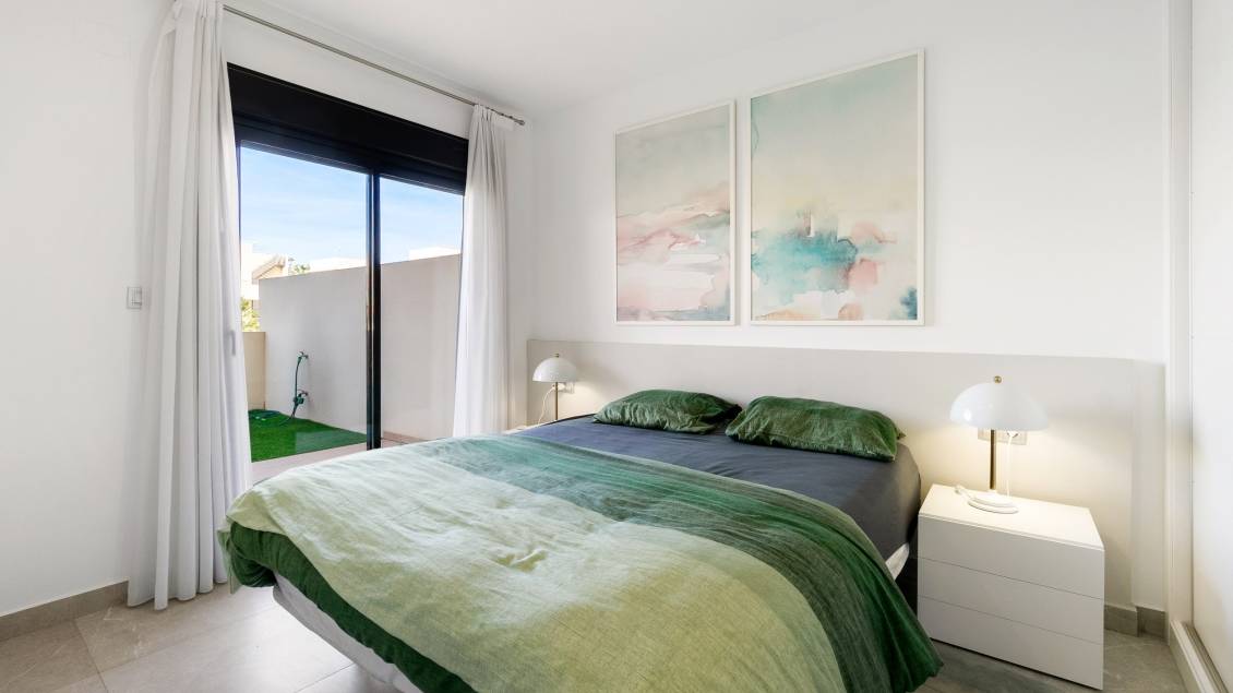 Modern apartment in Jardines de Montesolana, Orihuela Costa. This partment distributed in two bedrooms and two bathrooms. It has a spacious living-dining room with open plan kitchen and direct access to the large garden of 43 m2 with views to the communal areas of the residential with south orientation. It is located in the Jardines de Montesolana development which has a communal swimming pool and garden areas. This residential is close to La Zenia Boulevard shopping centre (Orihuela Costa). La Zenia is close to Cabo Roig, Campoamor and Playa Flamenca. It is a growing area, close to all amenities and the famous La Zenia Boulevard shopping centre. Only a few minutes from the N-332 and the Mediterranean motorway AP-7 towards Alicante and Cartagena. There are also around the golf courses of Villamartin, Las Ramblas, Campoamor and Las Colinas.