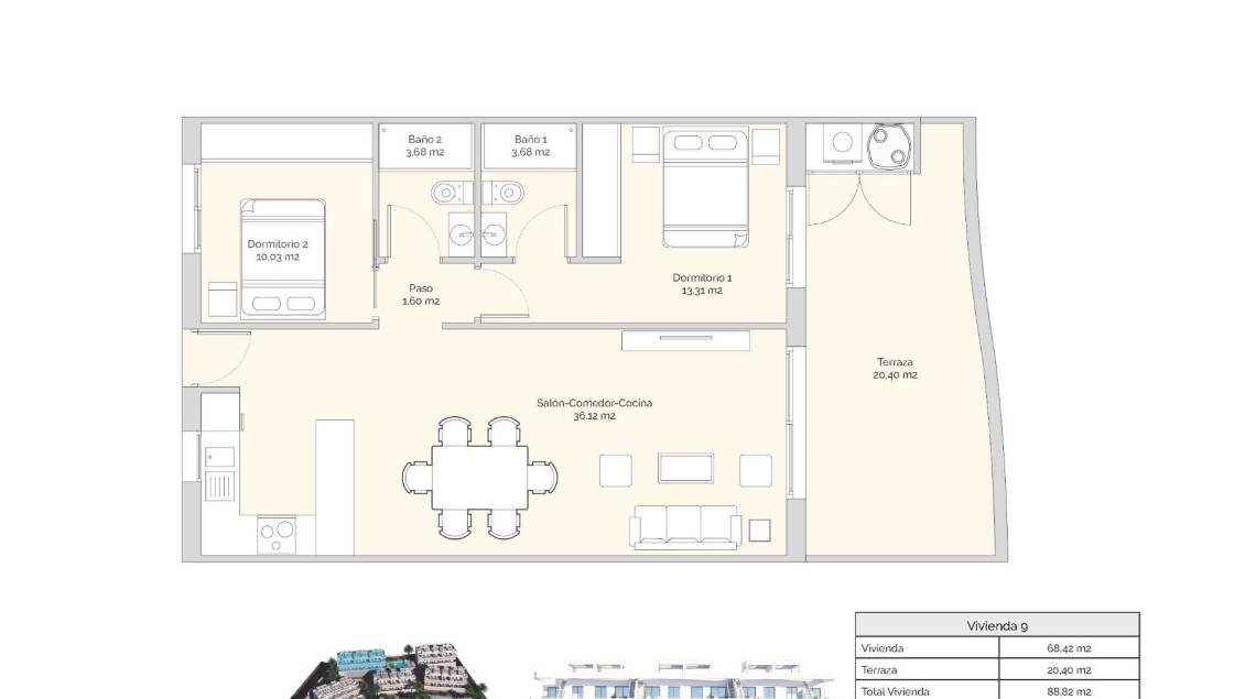 68 m2 · 2 Bedrooms · 2 Bathrooms · Pool