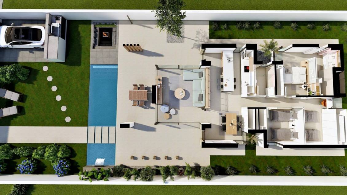 NEW BUILD VILLAS IN SAN FULGENCIO New Build villas San Fulgencio, just 5 km from the beach. The villas offer 3 bedrooms, 2 bathrooms and spacious kitchen, dining room, living room, swimming pool with waterfall and two pools: splash pool measuring 1.95x2.60 m and 0.6 m deep, and pool measuring 5.60x2.60 m, between 1 and 1.5 m variable depth. A large south facing porch allows the continuity of the living room with the outside, opening up to a modern and functional outdoor space where you can enjoy the private swimming pool, barbecue, chillout and large garden area that surrounds it. The simple and clear lines of the furniture contribute to its integration with the rest of the house. Wooden details add warmth to the atmosphere. Bathrooms where colour combined with natural and warm tones, create a cosy atmosphere, which together with the direct relationship with the outside ,allows you to connect with nature, achieving great moments of relaxation. The master bedroom has a private patio, which together with the light that penetrates through its windows, creates a relaxing atmosphere, perfect for rest and relaxation. San Fulgencio is a pleasant village with several restaurants and shops and the location is very good with its proximity to the fantastic beaches of La Marina and the slightly larger town of Guardamar. The town of San Fulgencio is situated around 30 minutes from Alicante-Elche airport, 6 km from the nearest golf course and just 5 km from the nearest beach.
